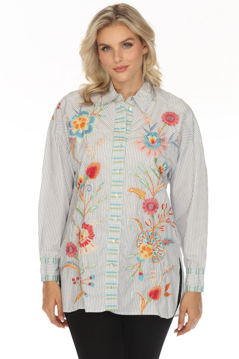 Bring a touch of boho-chic flair to your wardrobe with the Workshop Stripe Joele Bias Yoke Shirt Tunic. This striped tunic shirt is crafted from 100% breathable cotton and features vibrant floral placement embroidery for a bold, artistic look. With a collared neckline, long sleeves, and a button-down closure, this shirt tunic offers a relaxed fit that hits the hip with a side slit for added style. A versatile piece that pairs perfectly with jeans or leggings for a stylish, comfortable ensemble.