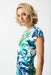 This stylish Joseph Ribkoff Vanilla/Multi Tropical Print Faux Wrap Midi Sheath Dress 242159 features a faux wrap design with a vibrant tropical print. Ruching and an o-ring detail at the front add a sophisticated touch, making this dress perfect for elegant occasions or summer gatherings.