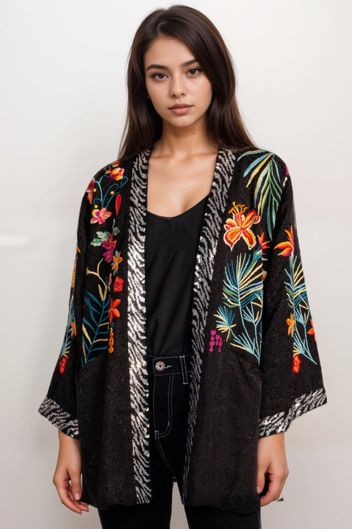 Add effortless sophistication to your wardrobe with the Johnny Was Dalaney Easy Jacket. This lightweight floral blazer is crafted from a soft, co...