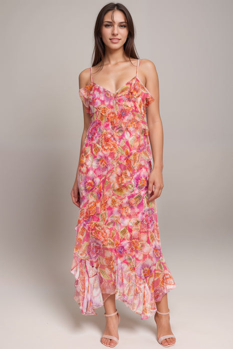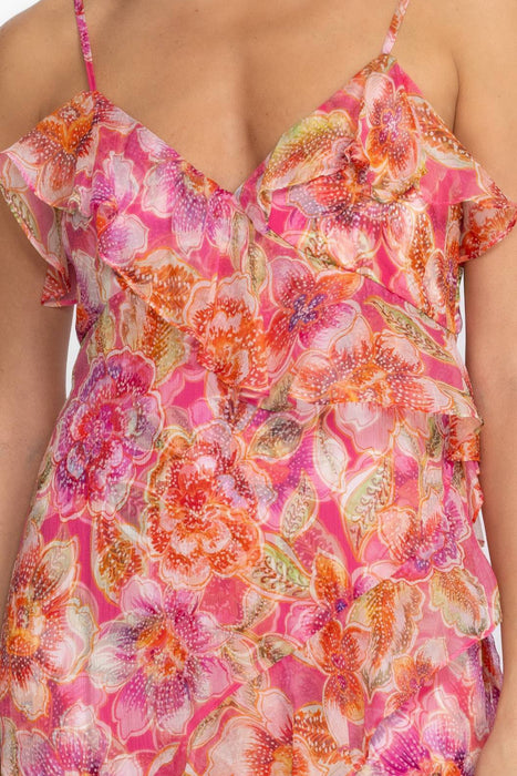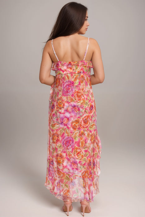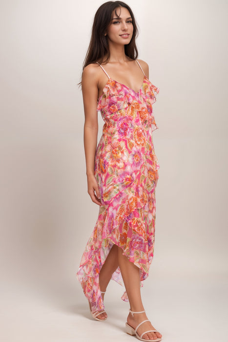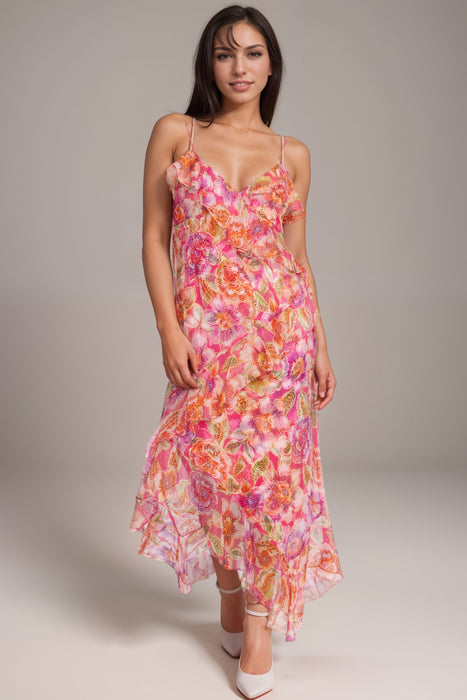 The Johnny Was Jade Katella Midi Dress is the epitome of feminine charm and stylish elegance. Crafted from luxurious silk, this dress feels lightweight and breezy, making it perfect for warm weather occasions. The soft floral print adds a touch of timeless beauty, effortlessly capturing the essence of effortless summer style. Designed with a deep v-neck and adjustable spaghetti straps, this dress offers a flattering, customizable fit. The delicate ruffles on the bodice and skirt enhance its romantic, whimsical vibe, while the asymmetric hem adds a modern twist, creating a flowy, graceful silhouette. Whether you're enjoying a sunny day out or attending a special event, the Johnny Was Jade Katella Midi Dress will have you turning heads with its effortlessly chic style.