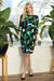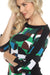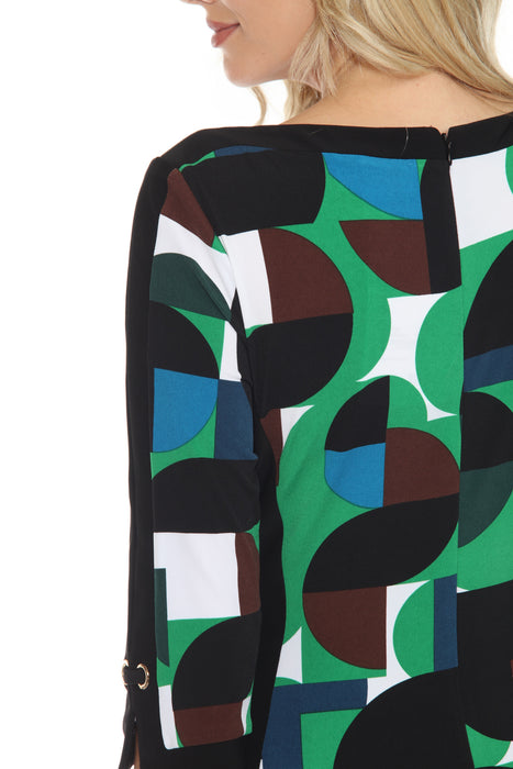 The Joseph Ribkoff Sheath Dress is both stylish and comfortable, featuring a solid trim on the neck and sides, a boat neckline, and 3/4 sleeves with grommets and slit cuffs. Its knee-length and form-fitting design is accentuated by a beautiful geometric print, making it a must-have for any fashion-forward woman. Made with silky-knit fabric, this dress is sure to be a wardrobe favorite.
