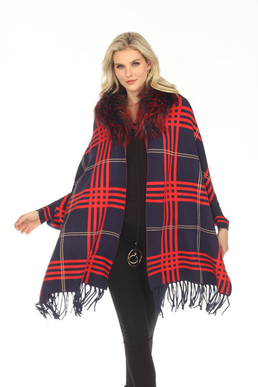 OO LA LA Navy Plaid Pattern Real Fur Collar Fringe Cape M1540