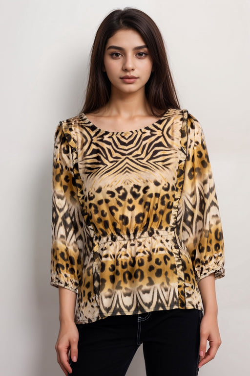 Joseph Ribkoff Beige/Black Animal Print Pleated Metallic Mesh Blouse 254140