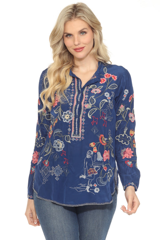 Johnny Was Blue Henley Stripe Embroidered Blouse W13524-7