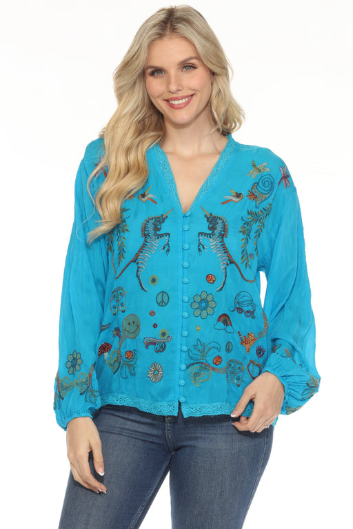 The Johnny Was Blouse blends comfort and artistry in a timeless everyday essential. Crafted from 100% soft, breathable cotton, this women’s blue st...
