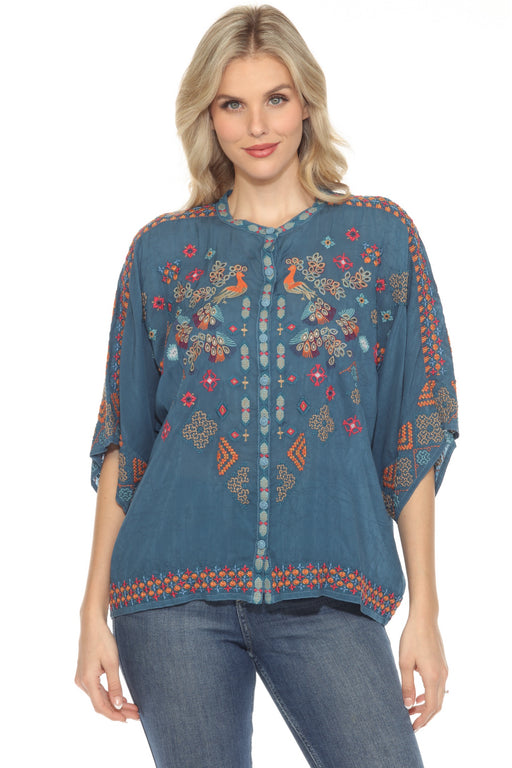 The Johnny Was Denim Blue Embroidered Shirt blends polished structure with easy everyday style. Crafted from soft yet structured fabric, this butto...