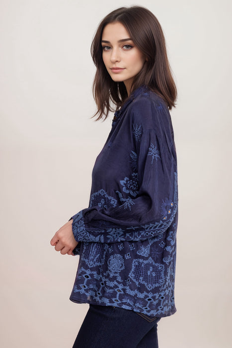 The Johnny Was Firefly Glow Slim Audrey Button Down combines effortless style with refined elegance. Made from breathable rayon, this solid-color shirt offers a lightweight, comfortable fit. The intricate tonal embroidery adds subtle charm, while the collared neckline and button-down closure create a classic, polished look. With its long sleeves, this versatile top can be worn alone or layered for a stylish, put-together ensemble. Pair it with jeans for a relaxed yet chic vibe, or dress it up with tailored pants for a sophisticated finish.