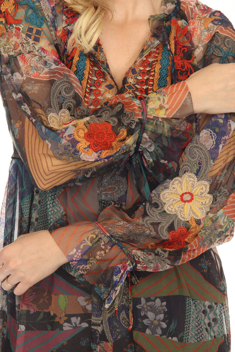 This Johnny Was Ilyana Mesh Blouse is a trendy must-have with a boho-chic look. Ensure your wardrobe shows you off to your best advantage with clothing from Johnny Was. It is made of lightweight embroidered mesh with an inner slip, featuring a v-neckline with tie, long sleeves with tie cuffs, and a hem that hits the hip.