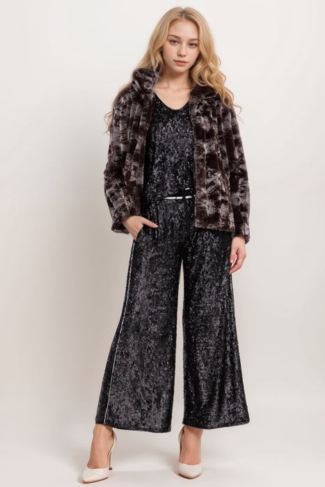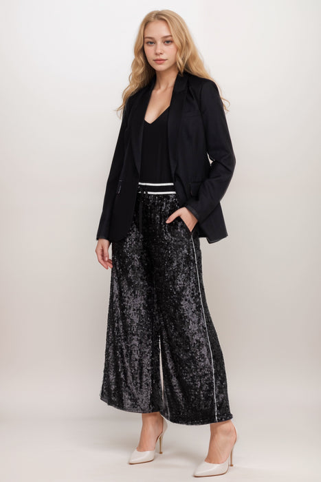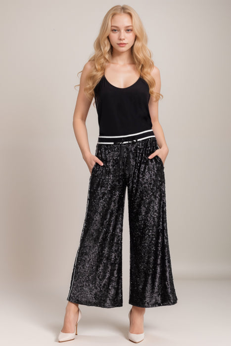 Step into the spotlight with the Johnny Was Gabie Sequin Pant. A bold, fashion-forward choice for those who love to dazzle. This wide leg pant is covered in shimmering sequins, delivering head-turning sparkle perfect for nights out, special events, or simply elevating your everyday style. Designed with comfort and style in mind, it features a pull-on silhouette with a striped waistband and drawstring for a flexible fit, along with practical side pockets for functionality. The flattering wide leg cut adds movement and ease, making this pant a standout yet wearable statement piece. Pair it with a simple blouse or silky tank to let the shine speak for itself, or go all-in on glam with a matching top. Wherever you wear them, expect compliments.