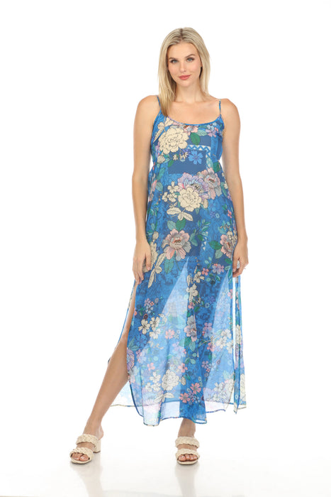 This Johnny Was Blue Dove Back Tie Strappy Maxi Dress embodies effortless boho-chic elegance. Crafted from lightweight silk-blend fabric, it features a stunning floral print, smocking at the back, and a thigh-high slit for added allure. Ideal for layering over a swimsuit or wearing as is, this maxi dress is a summer wardrobe essential.