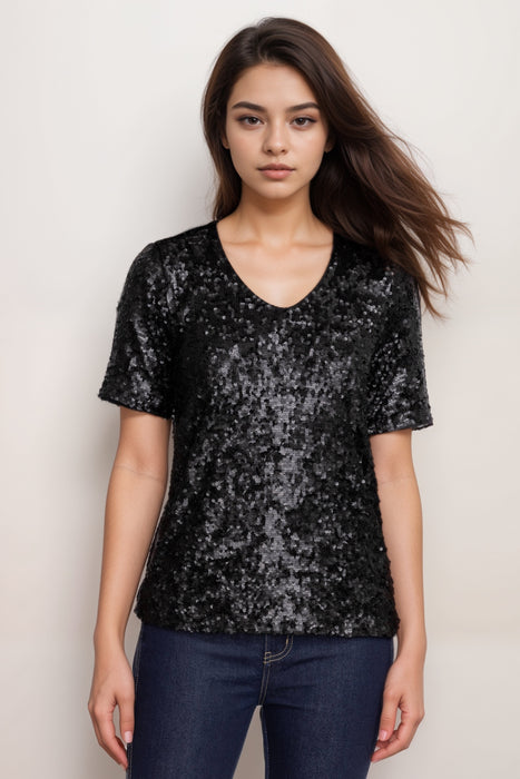 Sparkle and shine in the Johnny Was Bradley Sequin Blouse, a stunning piece that adds instant glamour to any wardrobe. Featuring a solid-color base, this blouse is adorned with sequins all over, creating a radiant, eye-catching effect that’s perfect for special occasions or a night out. The flattering v-neck adds a touch of elegance, while the short sleeves keep it breezy and light. With a convenient pullover design, this blouse is as easy to wear as it is beautiful. Whether you pair it with jeans for a casual-chic look or dress it up for a more formal affair, the Johnny Was Bradley Sequin Blouse brings just the right amount of sparkle and sophistication to any ensemble.
