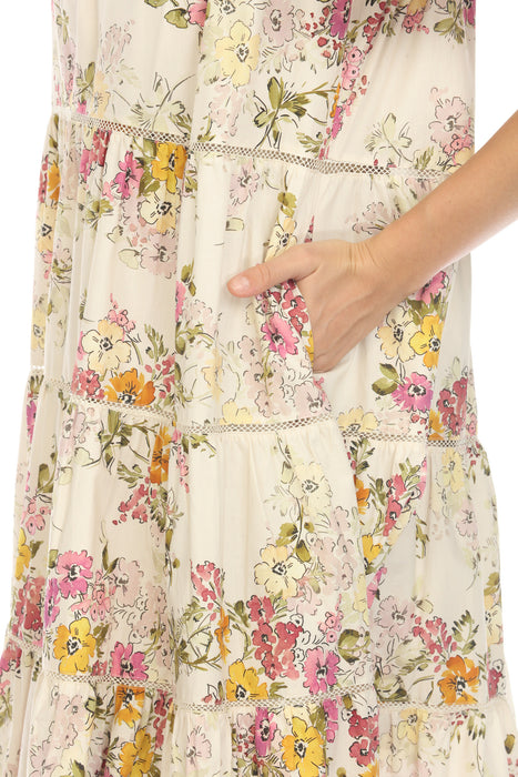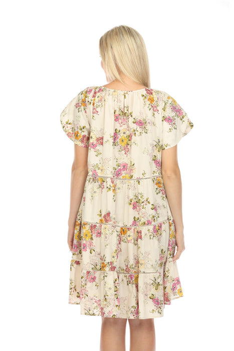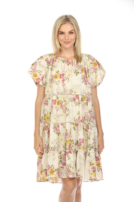 This Johnny Was Magnolia Tiered Mini Dress adds a bohemian-chic touch to any wardrobe. Made from soft 100% cotton with a vibrant floral print, this dress features a relaxed round neckline, short tulip sleeves, and a back button closure with a keyhole cutout. The tiered silhouette and side pockets complete its effortlessly stylish look, with a hem that falls above the knee.