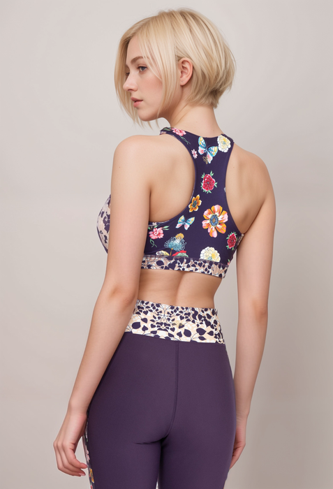 Designed to elevate your workout wardrobe, the Joy Vanda Bee Active Sports Bra features a colorful floral pattern on a black background. Its racerback design offers freedom of movement, while the 4-way stretch fabric ensures maximum comfort and support. Perfect for pairing with black or brightly colored leggings, this sports bra will keep you feeling confident and comfortable as you tone and strengthen.
