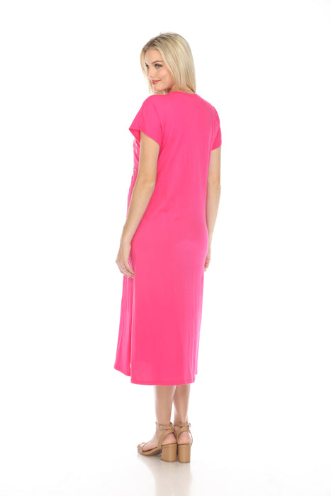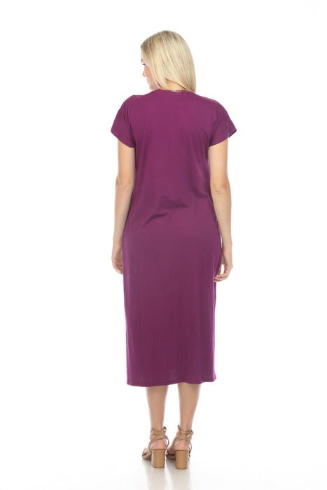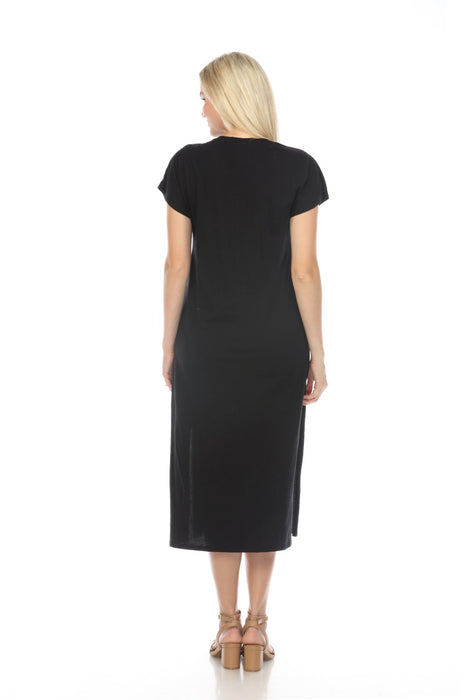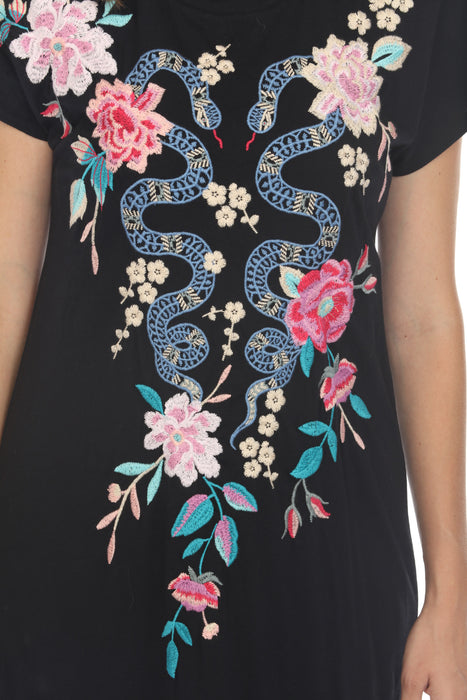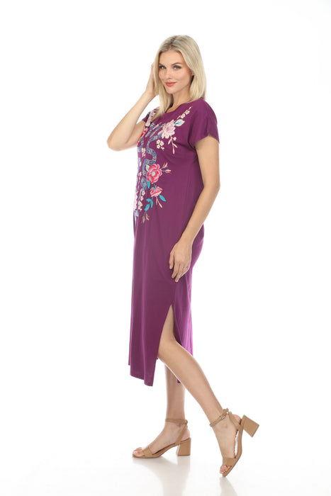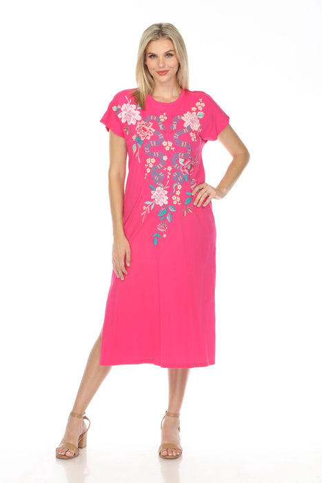 This Johnny Was Edie Relaxed Knit Dress brings a bohemian-chic touch to your wardrobe. Made from soft knit fabric in a solid color, it features vibrant floral embroidery that adds a lively detail. With a relaxed silhouette, round neckline, and short sleeves, this pullover style dress finishes with a hem falling past the knee and a thigh-high side slit, ideal for both casual days and stylish evenings.