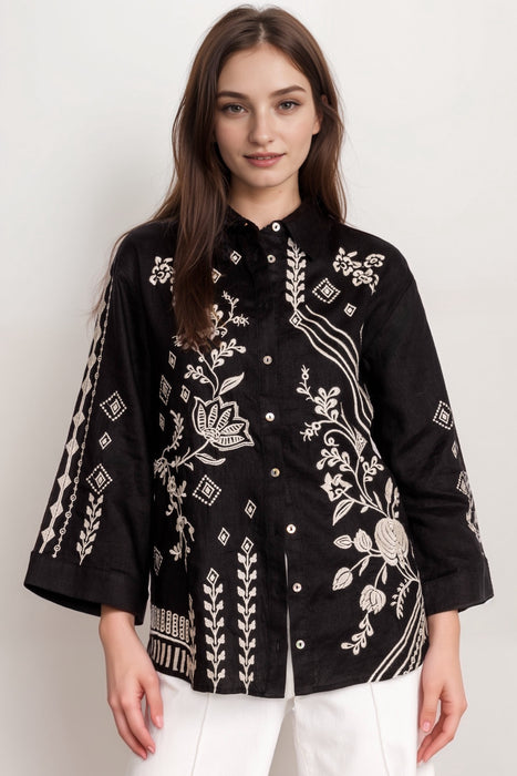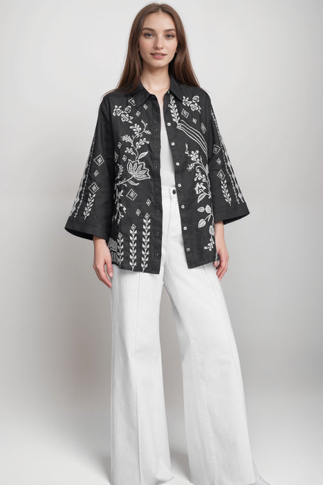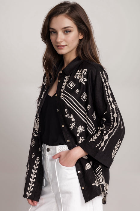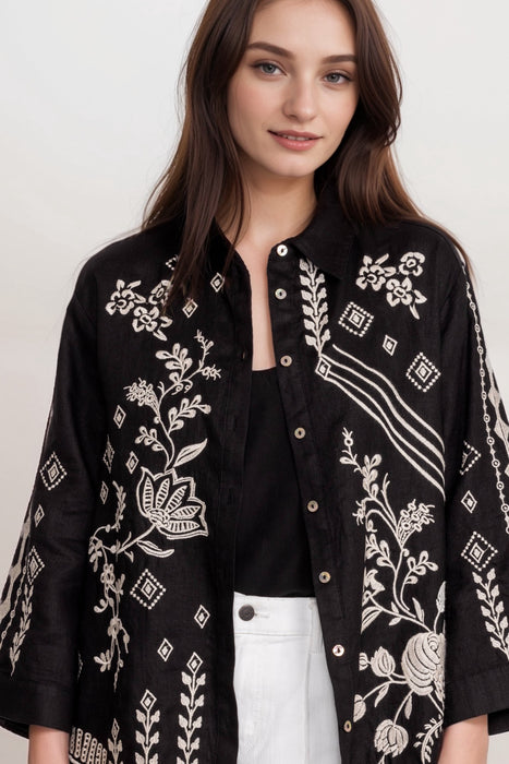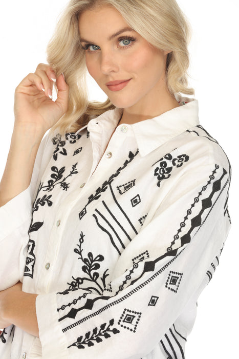 Elevate your style with the Johnny Was Kimono Sleeve Shirt. This shirt is designed with a solid color and features contrasting floral placement embroidery for a bold, boho-chic look. The kimono sleeves and collared neckline enhance its relaxed silhouette, while the button-down closure and hip-length hem complete the stylish design. Ideal for both casual and semi-formal occasions, this shirt is a must-have addition to your wardrobe.