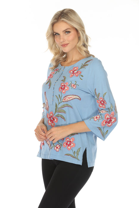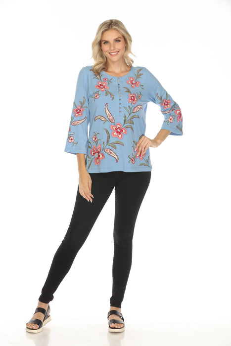 This Johnny Was Libbi 3/4 Sleeve Button Front Tee is a trendy must-have with a boho-chic look, perfect for enhancing your wardrobe. Made from soft, breathable cotton, it features vibrant floral embroidery that adds an elegant touch. The tee has a relaxed silhouette with a round neckline, 3/4 sleeves, partial button front closure, and a hip-length hem with side slits for added comfort.