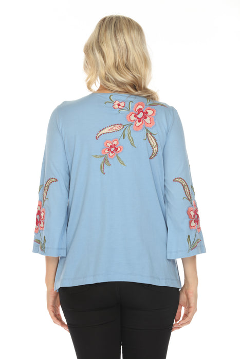 Fit Note: Johnny Was tops typically have a boho-casual look with relaxed, unstructured fits, often featuring drop-shoulder seams for a laid-back style.
