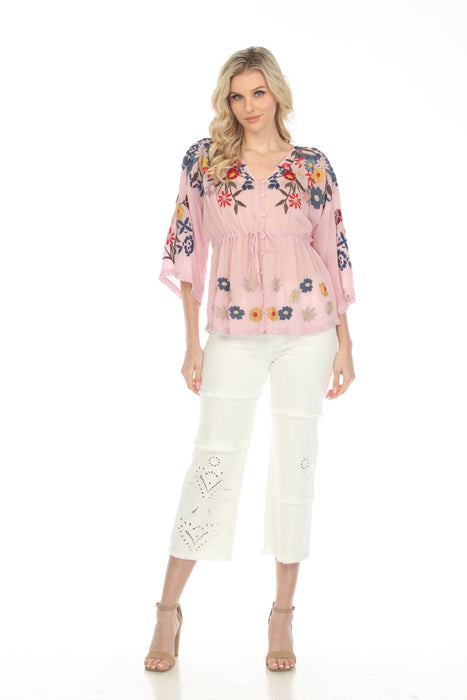 Many, if not most, tops designed and manufactured by Johnny Was are unstructured creating a "boho", casual look. Many styles also have drop-shoulder seams which accentuates an over-sized look. This type of styling is not intended to be a fitted silhouette. Please consider these observations on JW fit as you review the measurements in our listings.