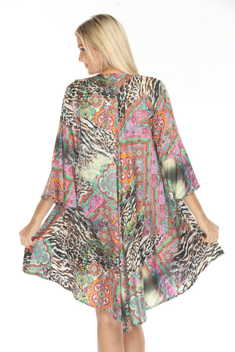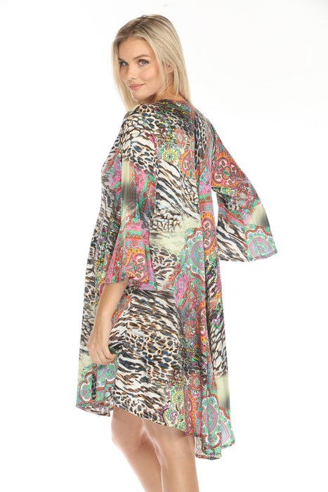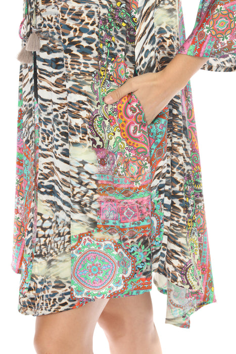 This Johnny Was Lotte Paisley Tie Kimono is the perfect definition of effortlessly chic that is cozy and stylish. Ensure your wardrobe shows you off to your best advantage with clothing from Johnny Was. This kimono is made of lightweight silk-blend fabric and is designed with colorful mixed paisley and animal prints. It also features 3/4 sleeves, side pockets, front tie closure, and an asymmetric hem that falls above the knee.
