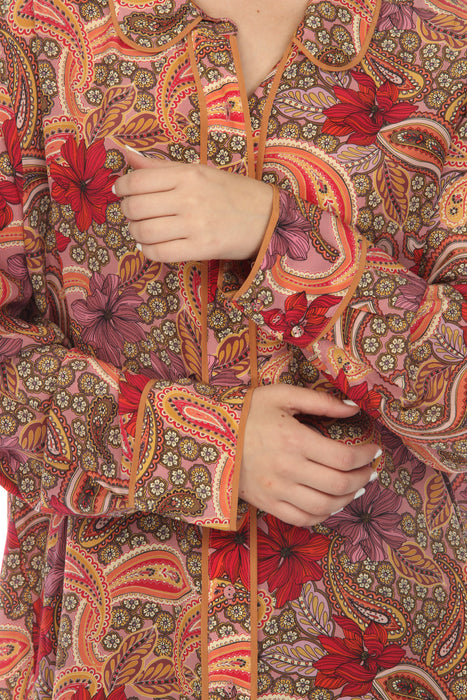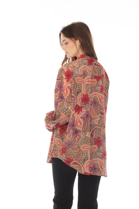 This Johnny Was Amy Piped Blouse is a trendy must-have with a boho-chic look. Show off your style with Johnny Was’s luxurious silk fabric, featuring vibrant paisley and floral prints with refined piping details. This blouse is designed with a collared neckline, long sleeves, a button-down closure, and a hi-low rounded hem that adds flow and elegance.