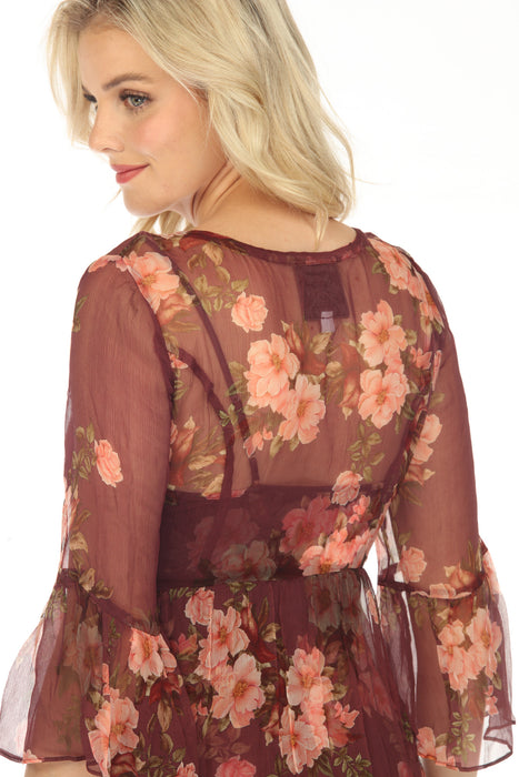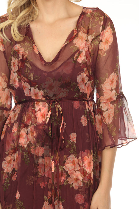 This Johnny Was Winonna Silk Maxi Dress gives off a bohemian-chic look. Made from semi-sheer silk, this dress features a floral print with a shirred waist and a back tie. It also includes a round neckline with a keyhole cutout, 3/4 bell sleeves, and a tiered ankle-length hem. Perfect for an elegant yet relaxed style.