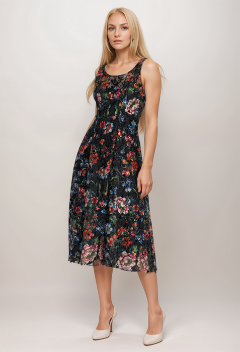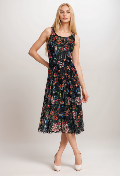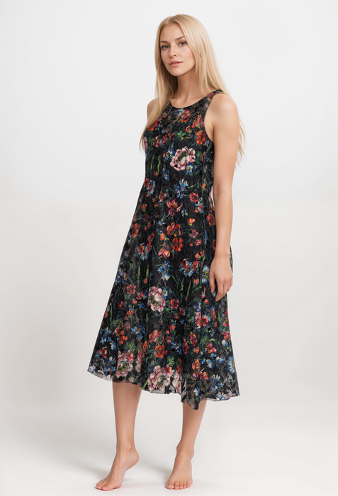 Embellished with rich floral designs on an inky black backdrop, the Mazzy Princess Dress is crafted from a lightweight, breezy fabric. Featuring a boat neck and intricate princess seams, this sleeveless dress is slip-lined for additional coverage. Pair with bold flats and a denim jacket for a polished casual look.