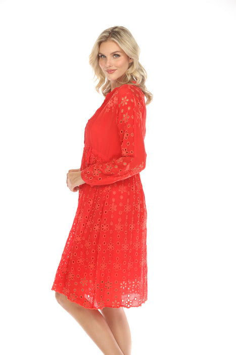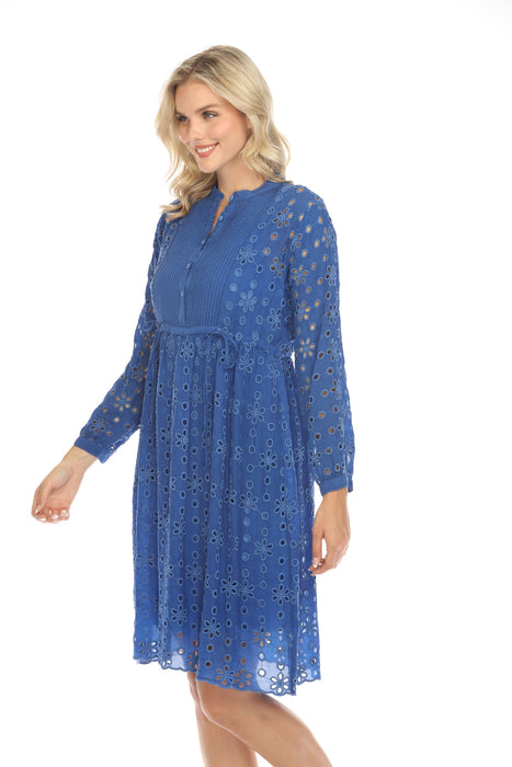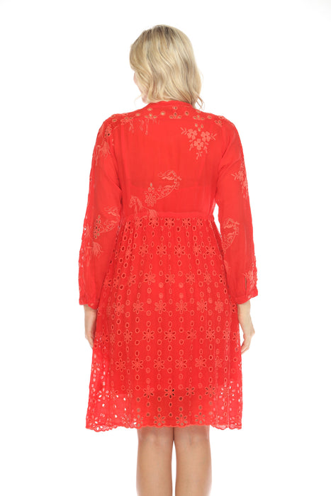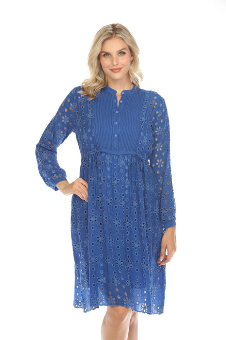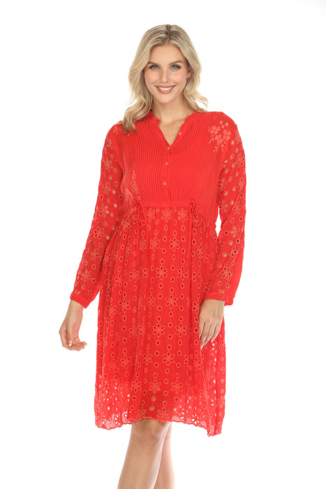 This Johnny Was Rodeo Nesi Dress exudes bohemian-chic elegance, crafted from soft, breathable fabric and detailed with intricate eyelets and tonal embroidery. Perfect for casual and formal occasions alike, this dress features an adjustable drawstring waist, band collar, and knee-length hem, complete with an inner slip for added comfort and style.