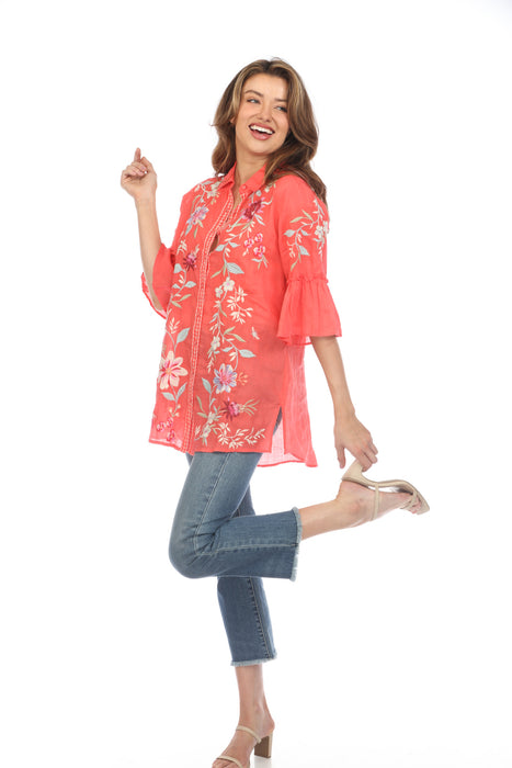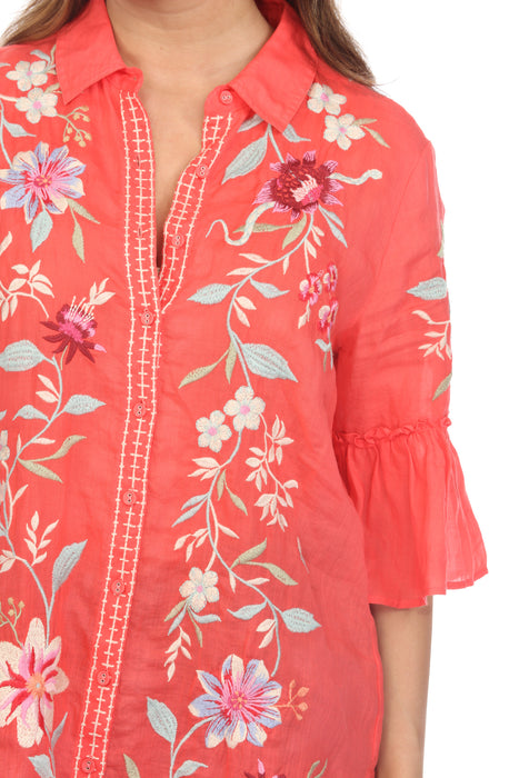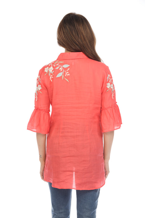 The Johnny Was Workshop Darcy Ruffle Sleeve Button-Down Tunic Top is a must-have addition to any boho chic wardrobe. Made from lightweight 100% ramie fabric, this tunic features a collared neckline and 3/4 sleeves with ruffled cuffs for a feminine, stylish look. The floral embroidery adds a vibrant touch, while the hi-low hem with side slits provides a flattering silhouette. Perfect for both casual and dressed-up occasions, this tunic combines comfort and style effortlessly.