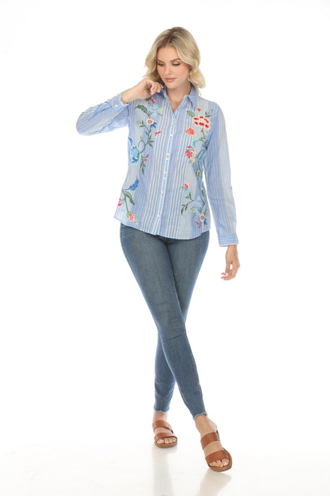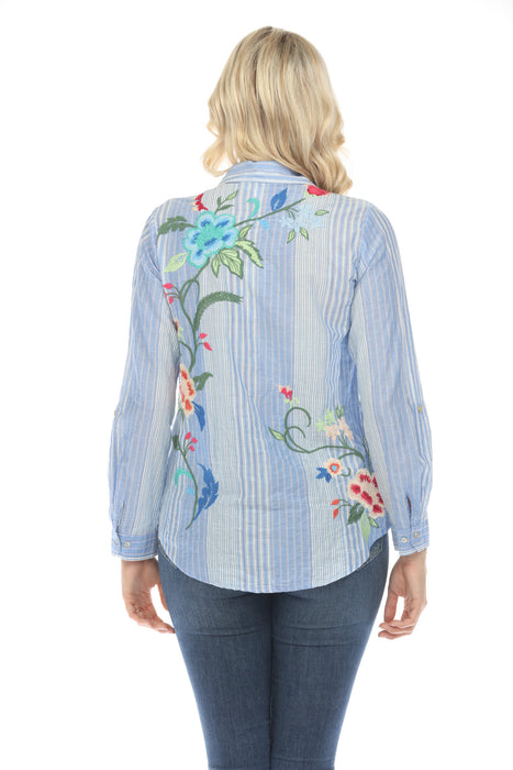 Crafted with a unique blend of style and comfort, the Johnny Was Madaleina Double Button Stripe Shirt brings a sophisticated boho-chic aesthetic to your wardrobe. Featuring colorful floral embroidery on striped fabric, this shirt includes a collared neckline, roll-tab sleeves, and a convenient double button-down closure. Perfect for pairing with jeans or skirts, it effortlessly combines fashion with functionality.