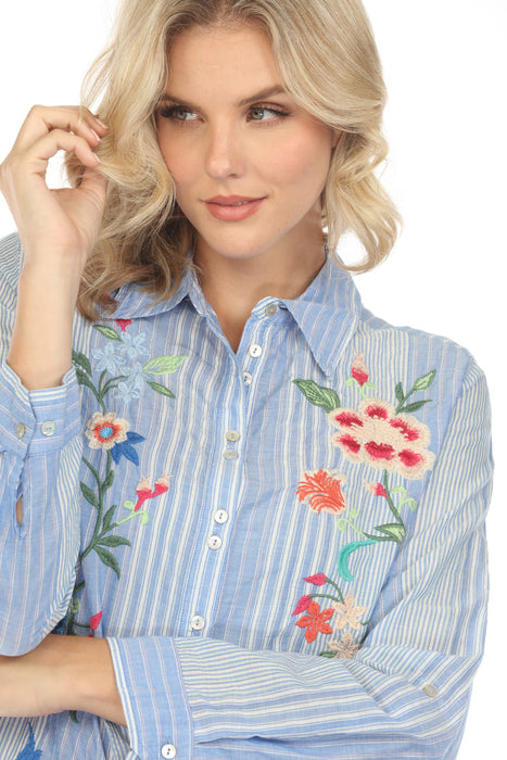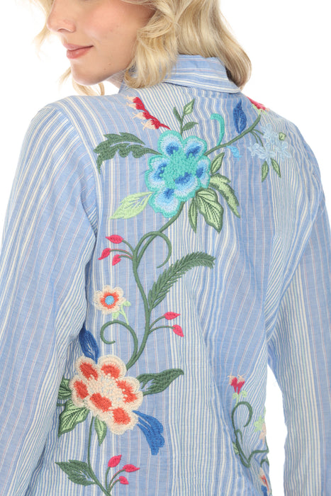 Madaleina Double Button Stripe Shirt - Boho Chic with Floral Embroidery