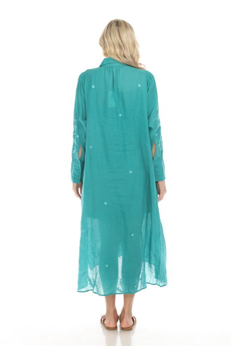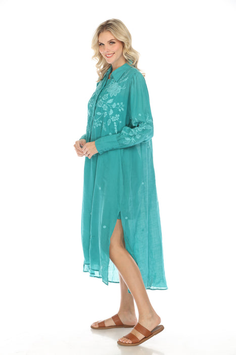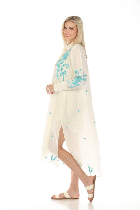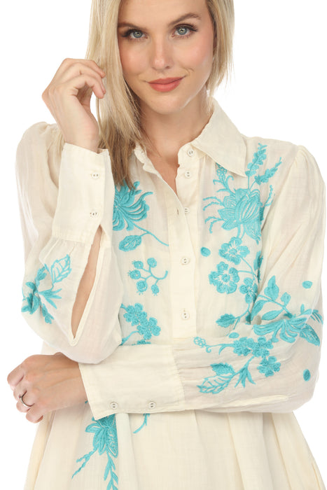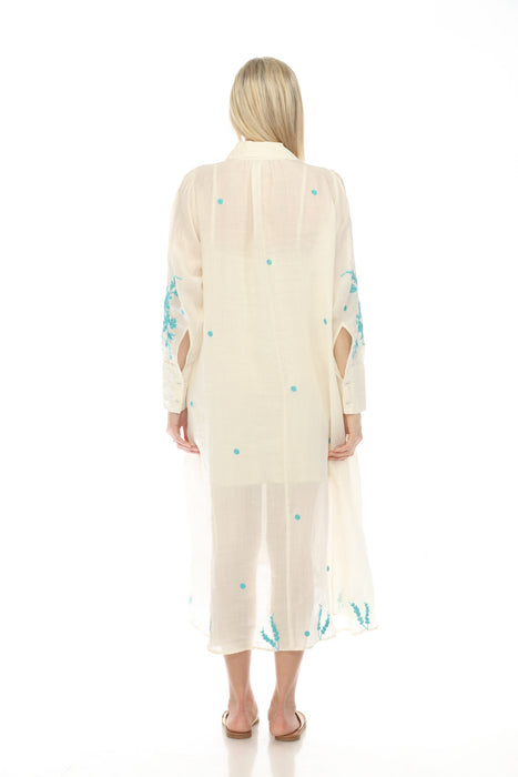 This Johnny Was Miel Henley Shirt Dress gives off a bohemian-chic look. Crafted from soft 100% ramie, the dress features contrasting floral placement embroidery with an inner slip. It includes a collared henley neckline, long sleeves, partial button closure, side pockets, and a hem that falls to the calf with a thigh-high side slit, offering a breezy, stylish appearance.