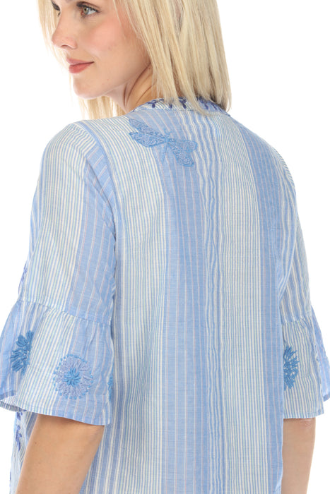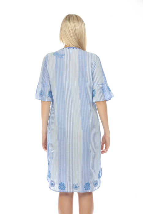 This Johnny Was Tarra Ruffle Sleeve Dress gives off a bohemian-chic look. Crafted from soft fabric, this shirt dress features a striped pattern with tonal placement embroidery. The dress includes a v-neckline, elbow-length bell sleeves with ruffle cuffs, a button front closure, and a knee-length curved shirttail hem for a flattering finish.