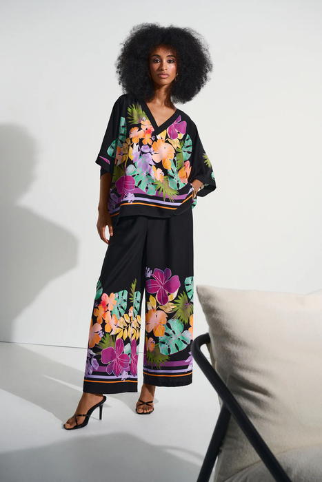 Elevate your wardrobe with this Joseph Ribkoff top featuring a striking black and multi floral print framed by a stylish border. The flattering V-shaped neckline and three-quarter dolman sleeves offer both comfort and a modern silhouette. Perfect for adding a touch of elegance to any outfit, this boxy top combines effortless style with versatile wearability.