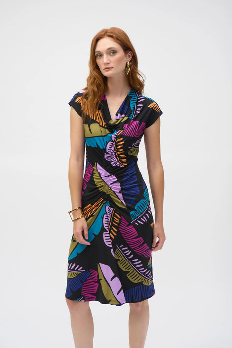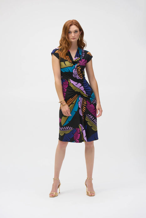 Joseph Ribkoff Black/Multi Tropical Print Shirred Sheath Dress 252096