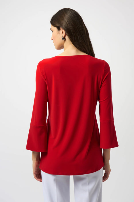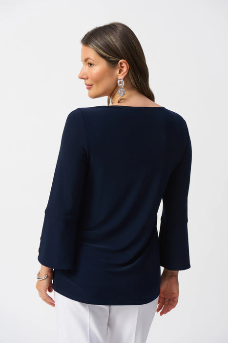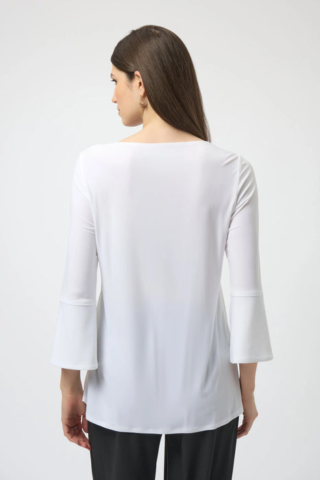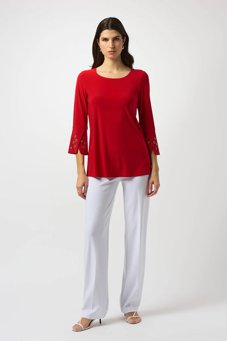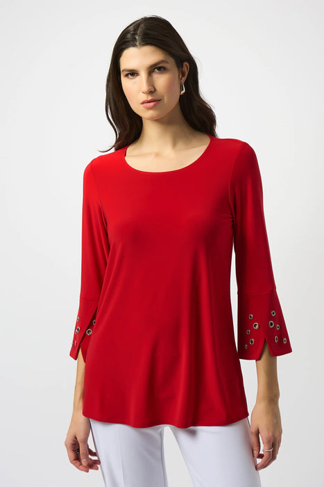 Effortlessly blend comfort and elegance with the Joseph Ribkoff Tunic Top—a stylish, casual piece designed for everyday versatility. Made from luxe silky knit fabric in a flattering solid color, this flared tunic offers a comfortable drape and modern silhouette. Featuring a classic round neck and 3/4 bell sleeves, it’s the perfect go-to for laid-back sophistication. The embellished grommets at the cuffs add just the right amount of edge to this simple yet polished top. Pair it with slim-fit trousers or leggings for an effortlessly chic look, whether you're headed to brunch or running errands in style.