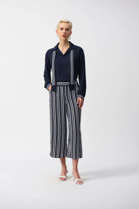 Elevate your wardrobe with the Joseph Ribkoff Midnight Blue/Vanilla Stripe Scarf Georgette Boxy Top. Featuring a woven stripe scarf elegantly attached at the back neckline with a loop and button, this top combines style and sophistication. The shirt collar and long puff sleeves with striped woven cuffs add a refined touch, while the solid band at the scarf ends and back pleat enhance its unique design. Perfect for making a chic statement with effortless comfort. Best paired with Joseph Ribkoff 251162 pant.