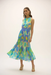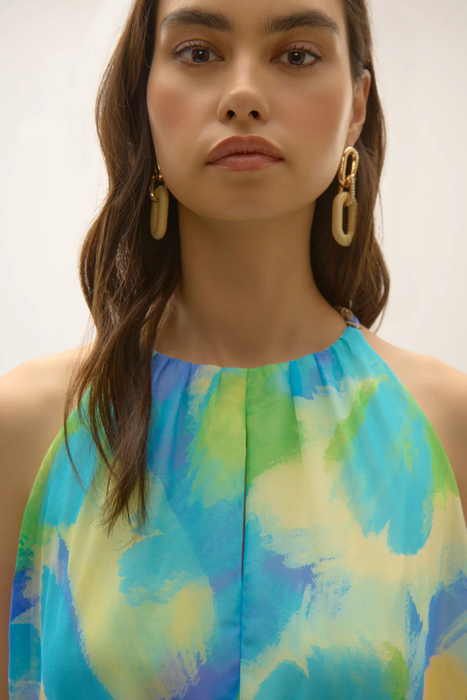 Elevate your style with this Joseph Ribkoff dress featuring a vibrant multi abstract print and a flattering fit-and-flare silhouette. The halter neckline and sleeveless design highlight your shoulders, while the gold chain detail on the straps adds a touch of elegance. A pleated chiffon skirt flows gracefully, complemented by smocking at the back waistband for a comfortable, tailored fit. Perfect for making a statement at any event.