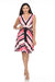 This stylish Joseph Ribkoff A-line dress is designed in a chevron tie-dye pattern with tie detail on the front. It also features a v-neckline, sleeveless, back zipper closure, and a hem that falls above the knee.