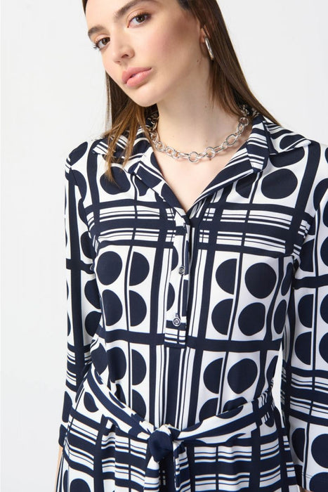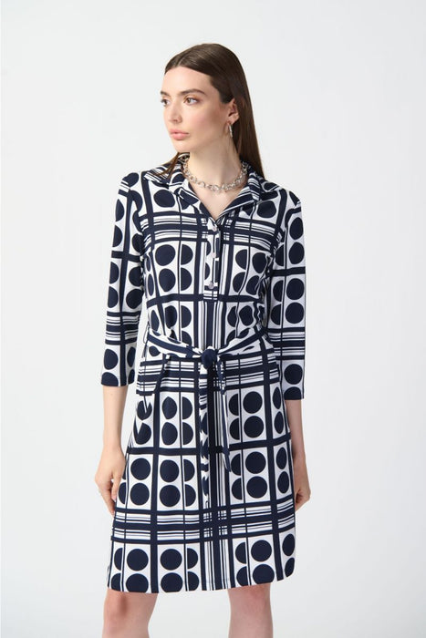 Joseph Ribkoff Vanilla/Midnight Dot Print Waist Tie Shirt Dress 241001