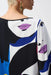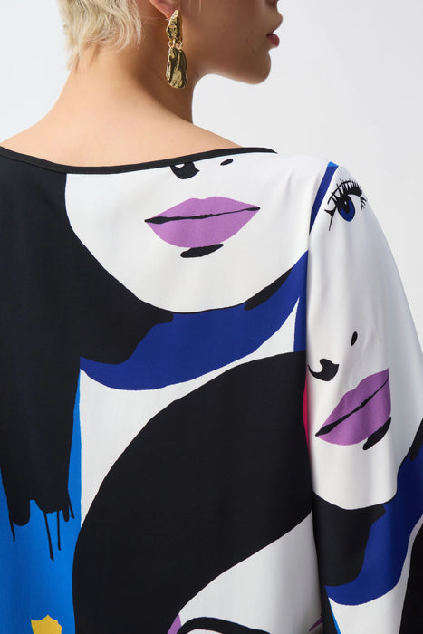 Make a bold statement in this Joseph Ribkoff top, a lightweight woven blouse that combines colorful color block panels with an artistic face print. Designed with a boxy, relaxed fit, it features 3/4 puff sleeves and a keyhole neckline with a gold-tone ornament for a touch of glam. This pullover top is effortlessly chic and stylish, perfect for pairing with jeans or tailored pants for an elevated everyday look.