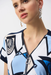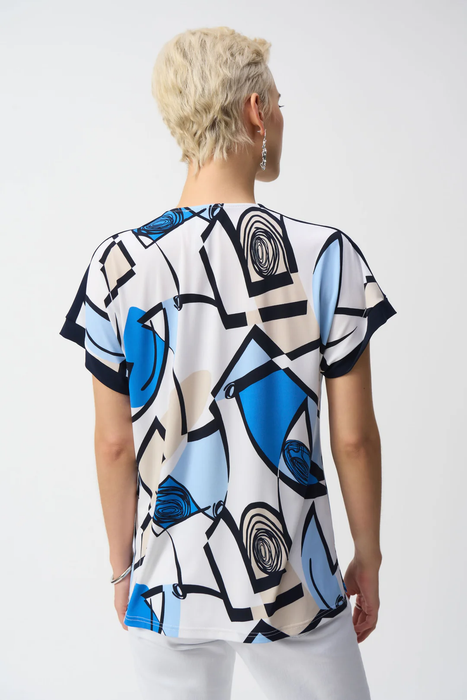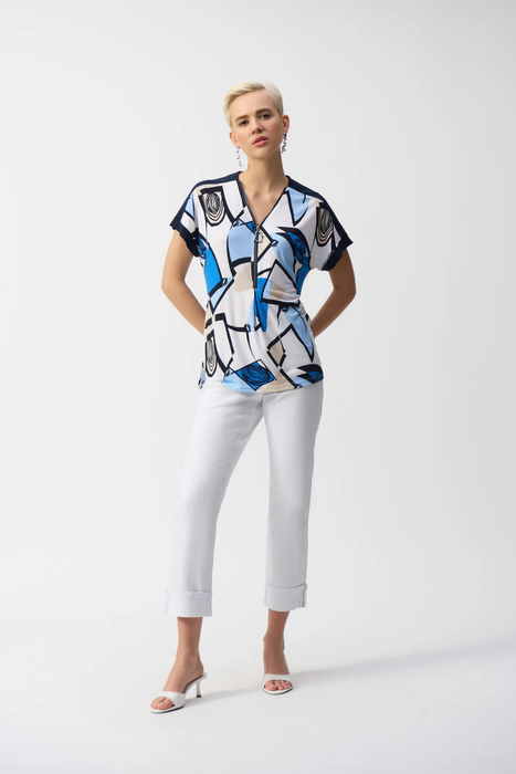Elevate your wardrobe with this striking Joseph Ribkoff top featuring a convenient front zipper and flattering V-neck. The short dolman sleeves with silky knit bands create a sophisticated silhouette, while the front pleat adds dimension. Side slit details enhance movement and comfort, making this geometric print top perfect for both casual outings and dressier occasions.