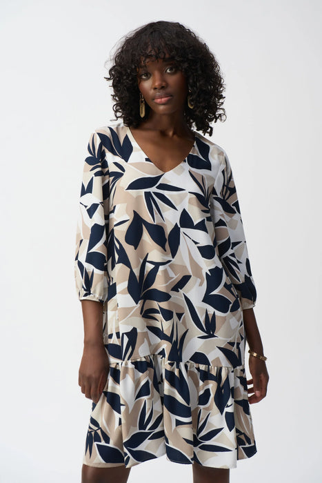 Joseph Ribkoff Vanilla/Multi Leaf Print Puff Sleeve Trapeze Dress 251003
