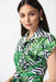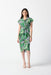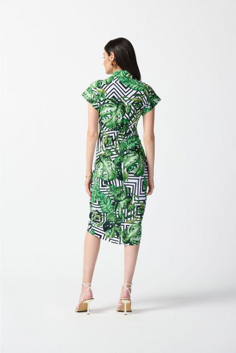 This vibrant Joseph Ribkoff shirt dress brings a touch of tropical elegance with its eye-catching print over a border design. Featuring a waist tie detail for a flattering fit, this dress includes a collared neckline, short dolman sleeves, and a button-front closure. The hem falls just past the knee, offering a breezy, stylish look for any occasion.